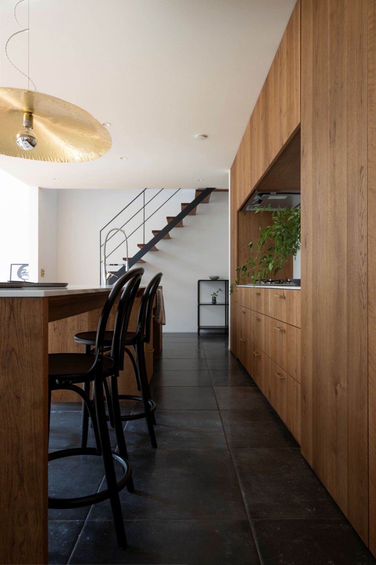 ダイニングとキッチンは、天板を一直線に揃えることを優先した設計。